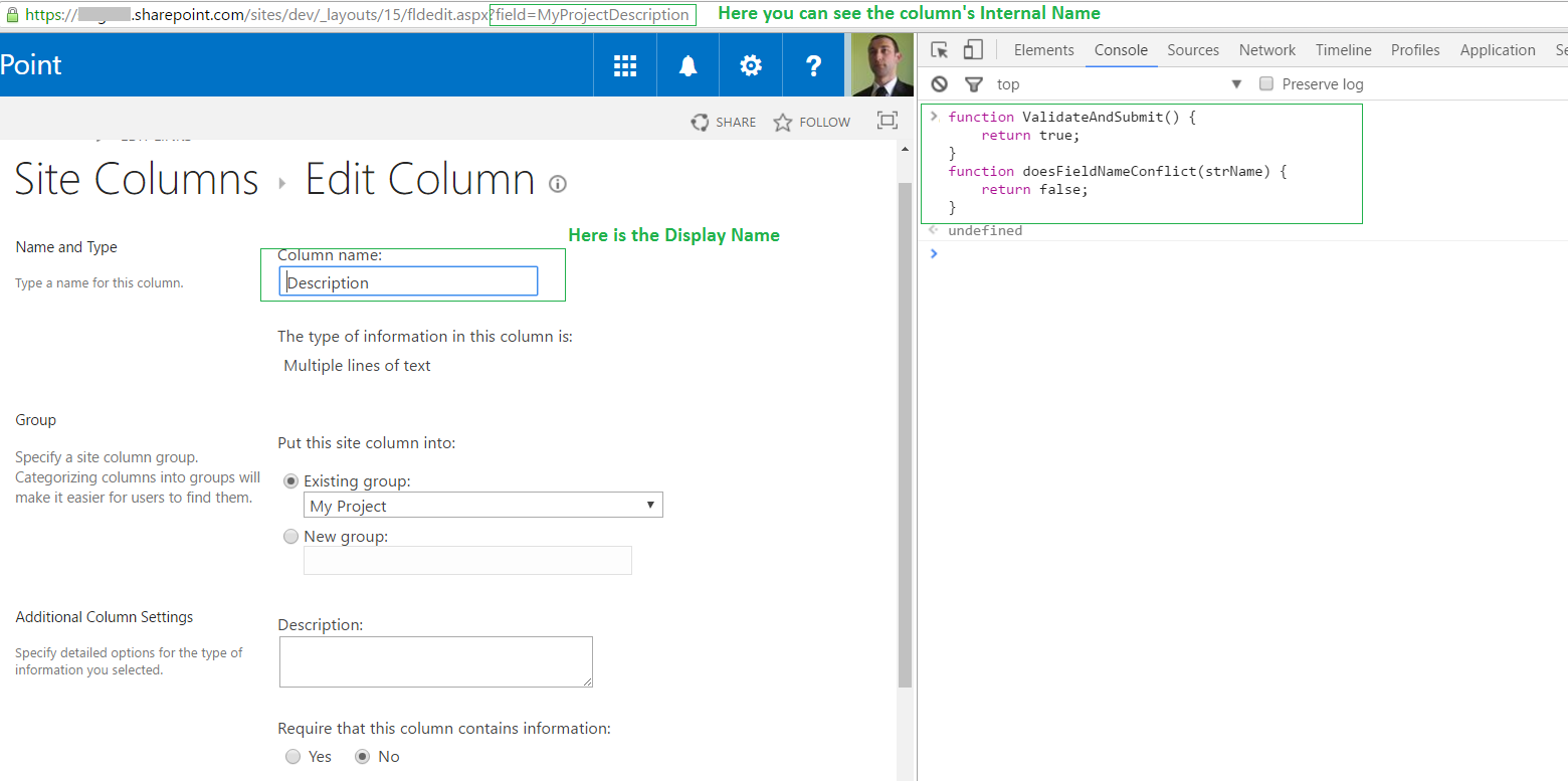This will create column with Internal Name: MyProjectDescription and Display Name: MyProjectDescription